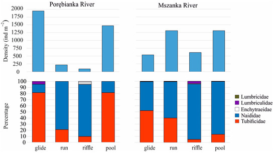 The taxonomic richness of Oligochaeta was similar in the Mszanka and Porębianka rivers (25 and 24 taxa, respectively). The family Naididae was represented by 10 and 13 species, respectively, whereas the family Tubificidae included 6 taxa and numerous juvenile individuals in each river (Table 3 and Table S1). The other families were less numerous. A greater diversity of common, primarily semi-aquatic Enchytraeidae taxa was found in the Mszanka River (5 taxa) compared to the Porębianka River (1 taxon). In both rivers, the Lumbriculidae and Lumbricidae families were represented by single species. In both rivers, the dominant families were Tubificidae and Naididae, which accounted for 94.5–100% of the total in the studied habitats (Figure 2). Tubificidae, which are typically associated with muddy substrates [20,22], were present in all habitats, although particular species were usually restricted to site-specific distribution. They were particularly abundant in the most silted habitats; in the glides and pools of the Porębianka River and in the glides and runs of the Mszanka River (up to 81.7%) (Figure 2, Table S1) [15]. Inversely, Naididae were more common on stony or gravelly bottoms in both rivers (up to 90.7% in the riffles of the Mszanka River) (Figure 2, Table S1). Within this family, Nais elinguis, a species known for being resistant to extreme environmental conditions [31], dominated (Table 4). This species prevailed in the runs and riffles of the Porębianka River and in most habitats of the Mszanka River. Despite having the same dominant species, both rivers shared only 14 species, resulting in a Jaccard index of 0.56, indicating a moderate similarity in species composition.