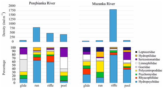 The density and dominant families of Trichoptera in the studied habitats of the Porębianka and Mszanka rivers in the early 2020s.