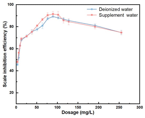 In previous studies, the scale inhibition performance of AS-582 was briefly evaluated, but the scale inhibition performance under different water quality conditions and the scale inhibition mechanism were lacking [15]. Therefore, using deionized water and the cooling water supplement from the converter station synchronous condenser (hereinafter referred to as “supplement water”) as experimental water, static calcium carbonate deposition tests were conducted on the scale inhibitor AS-582 at various dosages. The scale inhibition performance is shown in Figure 2.