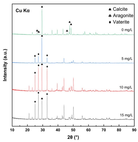 Calcium carbonate has three common crystalline forms: calcite, aragonite, and vaterite. From a thermodynamic stability perspective, calcite is the most stable, while vaterite, which exists in a metastable state, is the least stable, and aragonite lies in between [28]. Therefore, when the crystal form of calcium carbonate scale is mainly cubic calcite or strip-shaped aragonite, its structure is compact and its texture is hard. When the main crystal form of calcium carbonate scale is vaterite, its structure is loose and porous, and it is difficult to grow. These irregular spherical crystals are often suspended in water [20]. After conducting static calcium carbonate deposition tests, the calcium carbonate scales were collected and characterized for their phase composition and microstructure using X-ray diffraction (XRD) and scanning electron microscopy (SEM).