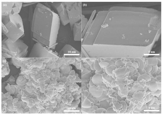SEM images of calcium carbonate scale samples before and after the addition of scale inhibitor: (a,b) without scale inhibitor; (c,d) with a scale inhibitor addition of 15 mg/L.