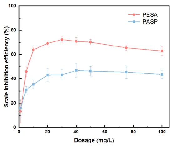 Variation in scale inhibition rates of two green polymer inhibitors, PESA and PASP, with dosage.