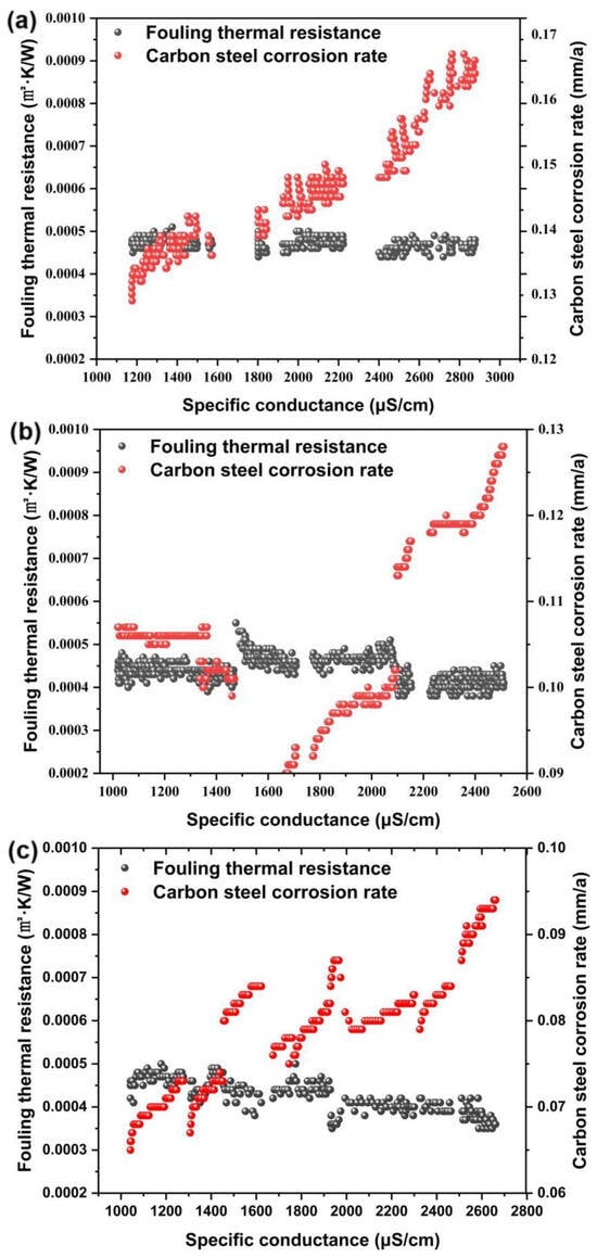 (a) Carbon steel corrosion rate and fouling thermal resistance at different ion concentrations without the addition of corrosion scale inhibitors. (b) With the addition of 90 mg/L AS-582. (c) With the addition of a 90 mg/L phosphorus reduction formulation.