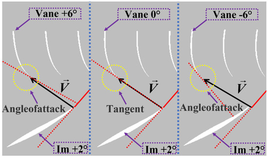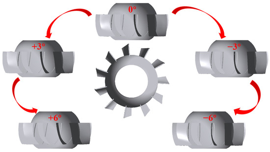 We attempt to transform the fixed guide vane in the guide vane body into an adjustable guide vane, replace the cylindrical hub of the fixed guide vane with a spherical one, and redesign the inlet angle of the adjustable guide vane using a velocity triangle based on the Euler motion equation. We attempted to transform the fixed guide vanes into adjustable guide vanes, replacing the cylindrical hub with a spherical hub and redesigning the inlet angle of the adjustable guide vanes using velocity triangles based on Euler’s equations of motion. As for the predetermined rotation axis, the guide vane can be rotated ±3° and ±6°. According to the right-hand rule, the rotation direction is roughly perpendicular to the paper surface. Clockwise rotation is a negative angle (the leading-edge placement angle of the guide vane increases), and counterclockwise rotation is a positive angle (the leading-edge placement angle of the guide vane decreases), as shown in Figure 2.