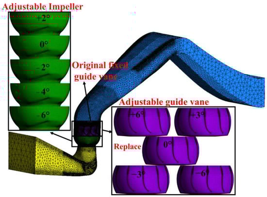 We establish a three-dimensional unsteady flow numerical analysis model for the entire passage, with the fluid domain including an elbow inlet passage, impeller domain, guide vane domain, and siphon outlet passage. Hexahedral and tetrahedral meshes are used to discretize the computational domain. In the orthogonal experiment, five different angles of the impeller were used, with a total of five impeller grids. The guide vane body had a fixed guide vane and five angle-adjustable guide vanes, with a total of six guide vane grids. The grid is shown in Figure 3.