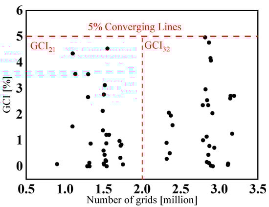 The grid independence test is a crucial step in CFD numerical simulation, as it plays a crucial role in the accuracy and reliability of the simulation. In this article, orthogonal experiments are used to screen the primary and secondary factors. A three-factor, five-level orthogonal table is used in the orthogonal experiment. Two control experiments are conducted, with a total of 30 matching models for impeller and different types or angle guide vane. Among of them are 5 models for fixed guide vanes and 25 models for adjustable guide vanes. Due to the subsequent research focus on the performance of the impeller and guide vane, a full passage simulation was adopted. The number of grids in the elbow inlet passage and the siphon outlet passage remained unchanged, with 179,148 and 281,164, respectively. Grid independence was verified for 30 models, and the fluid domains of the impeller and guide vane were discretized, refined, and sparse, resulting in a total of 90 sets of grids. There were three sets of grids with significant resolution in the models used in each orthogonal experiment. The GCI [24] value is shown in Figure 4.
