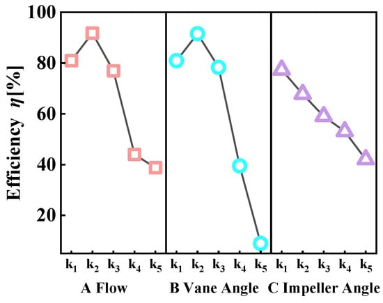The change in efficiency caused by factor B (guide vane angle) fluctuates due to changes in the levels of other factors. According to Figure 7, it can be clearly seen that as the angle of the impeller increases with factor C (impeller angle), the efficiency of the pump steadily decreases with changes in angles of +2°, 0°, −2°, −4°, and −6°. The increase in factor A (flow rate) will first increase and then decrease the efficiency, which is consistent with our current research on high-specific-speed mixed-flow pumps. With respect to factor C (impeller angle), as the impeller angle rotates from positive to negative, it can be seen that the k-avg value continuously decreases. This indicates that its adaptability to the flow rate has deteriorated, leading to a decrease in pump efficiency. Figure 7 shows the influence of factor A’s flow rate on the five impeller angle levels for factor C (impeller angle).