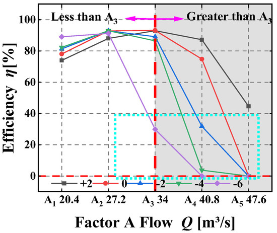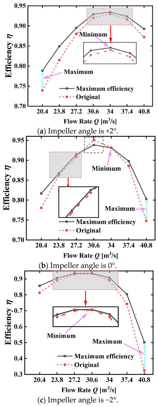 After the analysis in 6.1, we discovered the pattern of matching between the moving and stationary blades. However, in the actual operation process of a pump station, the impeller angle often rotates to a certain angle according to the water regulation task (the operating area changes) and works at this angle for a considerable period of time. During the flood season, the head decreases but inflow increases, so the flow rate of the pump station increases. The impeller needs to be adjusted at a positive angle to shift the efficiency curve to the right as a whole so that the efficiency area remains at the high-flow operating point. During the dry season, the head increases but inflow decreases, and the flow rate of the pump station decreases. The impeller needs to be adjusted towards a negative angle to shift the efficiency curve to the left as a whole, keeping the high-efficiency zone at the low-flow operating point.