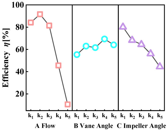 According to the range analysis figure, it can be concluded that the primary and secondary relationships of the factors were A > C > B. After using the adjustable guide vane, the impact of the factor (A flow rate) on the efficiency showed an absolute advantage among the three factors. This is because, in orthogonal experiments, there is a certain degree of randomness in the angle matching of the guide vane and the impeller. The angle match between the guide vane and the impeller greatly affects the flow of water through the system. Once mismatched, it can cause serious phenomena, such as separation vortices, impeller outflow impact on guide vane inlet, and blade passage blockage, that affect pump efficiency. In the orthogonal experiment with a fixed guide vane angle in Section 5.2.1, the range of factor C (impeller angle) is Rc35.31. In this orthogonal experiment with an adjustable-angle guide vane, the range of factor C (impeller angle) is Rc35.66, which is basically consistent. In the analysis of Section 5.2.1, we believe that the fixed guide vane 0° has a range value RB of 82.64, indicating that the fixed guide vane 0° cannot adapt well to changes in the impeller angle and flow rate caused by changes in the operating conditions. Therefore, there are significant differences in efficiency and range. The guide vane was improved to be adjustable, which could match to some extent with the impeller after angle adjustment. Although it was not a perfect match, the random matching of the dynamic and static blade angles reflected a relatively uniform distribution in the k-avg value. There was no significant range observed in the first experiment. In the past, the idea of orthogonal experiments often relied on large fluctuations in the value of k to determine which factor and level were most suitable. But it is difficult for us to analyze which angle is the so-called optimal angle because the flow rate, guide vane angle, and impeller angle have a coupled relationship. Perhaps only one combination of moving and stationary blades can achieve the highest efficiency under each operating condition (flow rate). After using the adjustable guide vane, the k-avg value did not change significantly with changes in flow rate and impeller angle, indicating that the adjustable guide vane improved the adaptability of the mixed-flow pump to changes in operating conditions.