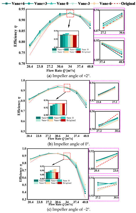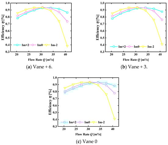 We controlled changes in operating conditions through the volumetric flow rate, as analyzed in the previous orthogonal experiment. Our GCI validated the model’s stability for five different guide vane angles and five different impeller angles. In the orthogonal experiment, we found that the matching effect with the existing five adjustable guide vane angles was not good when the impeller angles were −4° and −6°. Therefore, models with impeller angles of −4° and −6° were excluded, and only models with impeller angles of +2°, 0°, and −2° and adjustable guide vane angles of ±6°, ±3°, and 0° were studied here. The fifteen models used in this study have already been included in the previous GCI grid validation. There is no need to verify them again this time. After post-processing, reading, and organizing the calculation results, the flow efficiency curve was obtained, and is shown in Figure 10.