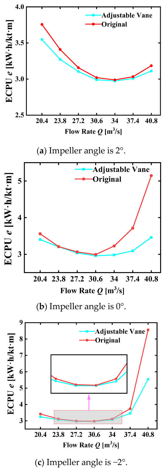 According to the energy consumption chart in Figure 14, we can see that the pump with the adjustable guide vane had significantly improved energy consumption compared to the original model in both low-flow and high-flow operating conditions. From Figure 14a, after the transformation, the overall energy consumption significantly decreased, and the operating point with an average reduction effect was the rated operating point (Figure 14b). Except for the 0.9 Qd operating point, the energy consumption at other operating points decreased, with a particularly significant reduction effect of 1.2 Qd. From Figure 14c, it can be seen that the effect of reducing energy consumption was not significant, but the energy consumption reduction effect was significant under high-flow conditions. We noticed that under extreme operating conditions, the energy consumption curve of the original model showed a sharp increase when the impeller angle was 0° or −2°. However, after being transformed into an adjustable guide vane, the energy consumption under extreme operating conditions was smoothly transitioned.
