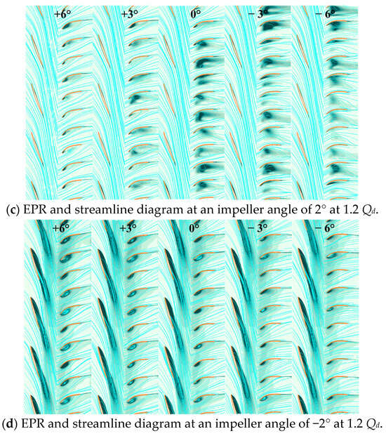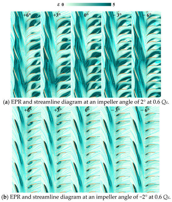 We input the formula for EPR into the CFD post to form a new parameter, then used this parameter to analyze the internal energy loss and flow characteristics of the impeller angle at 0.6 Qd and 1.2 Qd, which were 2° and −2°, respectively. We expanded the perspective to blade-to-blade, which is shown in the following figure.