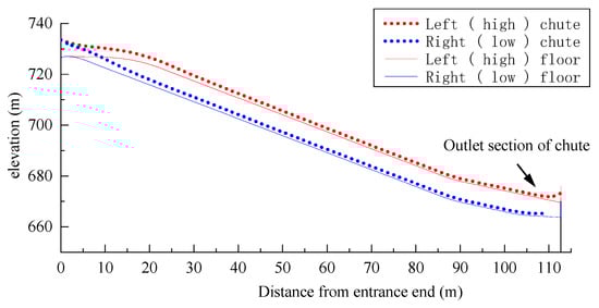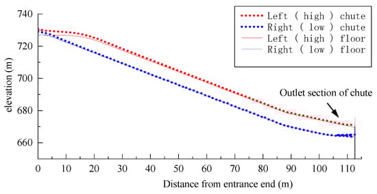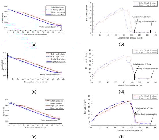 Figure 1b,e, it can be observed that under design flood level conditions, the pre-jump sections of both the left and right discharge channels were positioned about 100 m from the inlet (the starting section of the anti-arc section at the outlet of the channel). As shown in