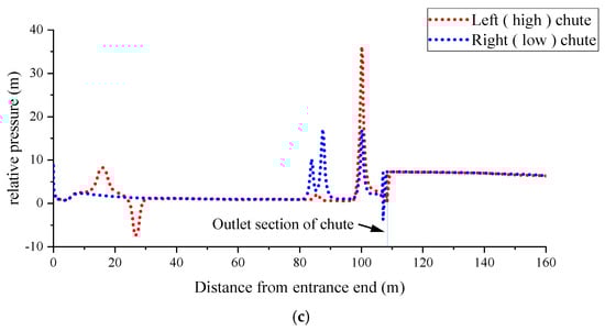Figure 5c, under the check flood level condition, there was no negative pressure zone on the bottom plate of the right chute. A large negative pressure zone appeared on the bottom plate of the left chute, within the range of 25 to 28 m from the inflow section, with the maximum negative pressure reaching approximately 8 m of the water column. The maximum time-averaged pressure of the right chute bottom plate occurred at the 100 m section, with a maximum relative pressure of about 16 m of the water column. The maximum time-averaged pressure of the left chute bottom plate was found at the same 100 m section, with a maximum relative pressure of 36 m of the water column.