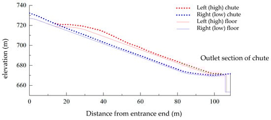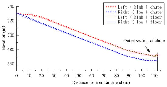 Figure 7 shows the distribution of the water surface along the centerline of the left and right chutes. According to the three-dimensional simulation results, during the flow process through the left and right chutes, the flow pattern of the right chute closely matched the previous conditions. After the adjustment, the left chute was parallel to the centerline, following the change made to the bend.