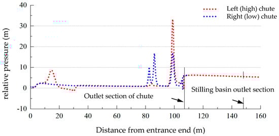 The numerical simulation results were analyzed, and the time-averaged pressure on the bottom plate in the calculation model was extracted along the central axis of the left and right chutes. The time-averaged relative pressure of the bottom plate under the check flood level condition is shown in