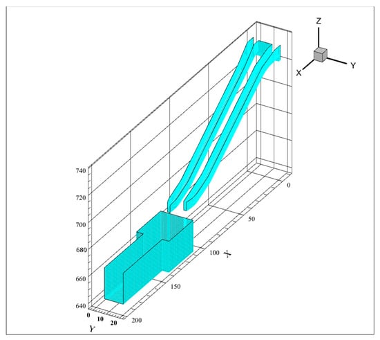 To enhance the disintegration of the water tongue after its lateral collision at the chute exit, the high and low dual-channel spillways were arranged with a 10 m spacing based on the engineering prototype. The collision angle of the outlet water tongue should be maximized to increase the lateral collision momentum. Additionally, to strengthen the lateral collision effect of the water tongue at the dual-channel spillway, the outlet configuration was optimized to a narrow lateral slit for further verification.
