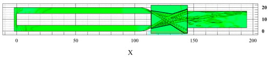 25]. For the water inlet, the velocity inlet and water level boundary conditions were applied, along with the known discharge flow, inlet area, uniform inflow conditions, and the following empirical formula: