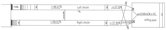 Figure 9). The outlet of the low-side spillway was adjusted to three configurations: 0°, 5°, and i = 10.05%. The jet direction of the high-side spillway was directed downward, and the outlet elevation was adjusted to create a counteracting effect, optimizing the double-channel counteracting spillway design.