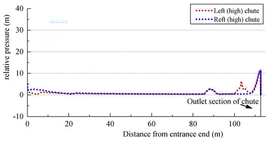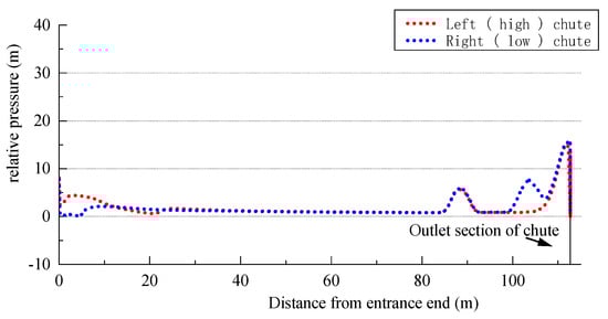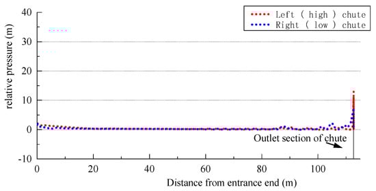 Figure 8. According to the simulation results, there was no negative pressure zone on the bottom plate of the right chute or the plunge pool under the check flood level condition. However, a negative pressure zone appeared on the left chute bottom plate within the range of 21.8 m to 31.0 m from the inflow section, with the maximum negative pressure reaching approximately 1.46 m of the water column.