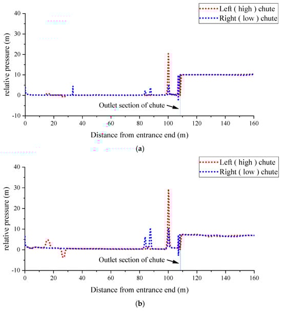 The pressure distribution on the dam surfaces of the high and low spillways was analyzed using the numerical simulation results. The time-averaged pressure along the central axes of the bottom plates for the left and right spillways was extracted, and the relative time-averaged pressure distributions for three operating conditions are presented in Figure 18, Figure 19 and Figure 20. The simulation results revealed that no negative pressure zones occurred on the bottom plates of the high and low spillways under any of the three water level conditions.