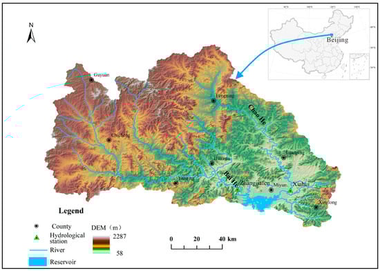 Figure 1). It was built in 1960 and is the main surface water source for Beijing. The Miyun Reservoir watershed is located in the transition zone between the North China Plain and the Inner Mongolia Plateau and belongs to the Yanshan Mountains. There are undulating mountains, crisscrossing gullies, and the ground is fragmented by cutting. The watershed area of Miyun Reservoir is 15,788 km