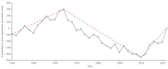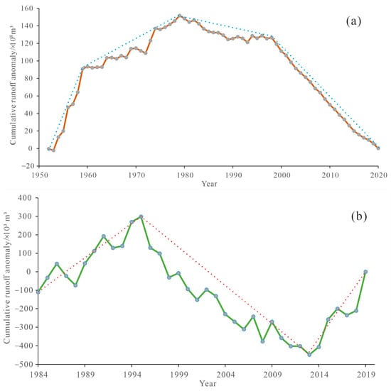 The cumulative anomaly method is a nonlinear statistical method that can effectively and intuitively reflect the mutation points and change trends of discrete data in long time series. It is widely used in hydrological studies such as the analysis of precipitation and runoff change trends [
