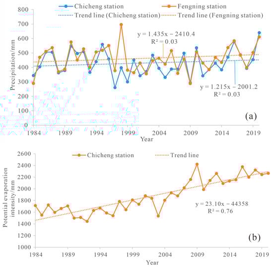 This paper collected the conventional surface meteorological data (including rainfall and potential evaporation intensity) from 1984 to 2020 of three national basic meteorological stations (Chicheng Station, Fengning Station, and Miyun Station), which were provided by the National Meteorological Science Data Center (