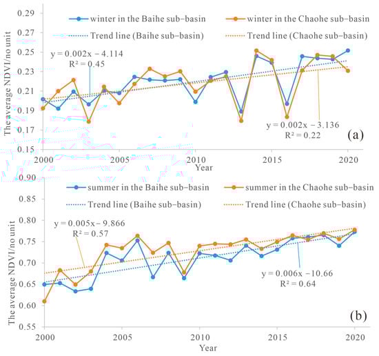 −2. During the period from 2000 to 2020, in winter, the average NDVI values in the Baihe River rose from 0.20 to 0.25, while those in the Chaohe River increased from 0.19 to 0.23; the increase in the NDVI reflects the continuous improvement of the vegetation conditions in the catchment area.