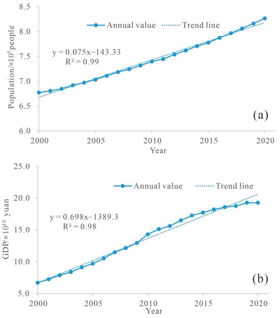 Figure 7a). Correspondingly, the GDP also shows an annual growth trend, with an average annual growth amount of CNY 68.9 billion (