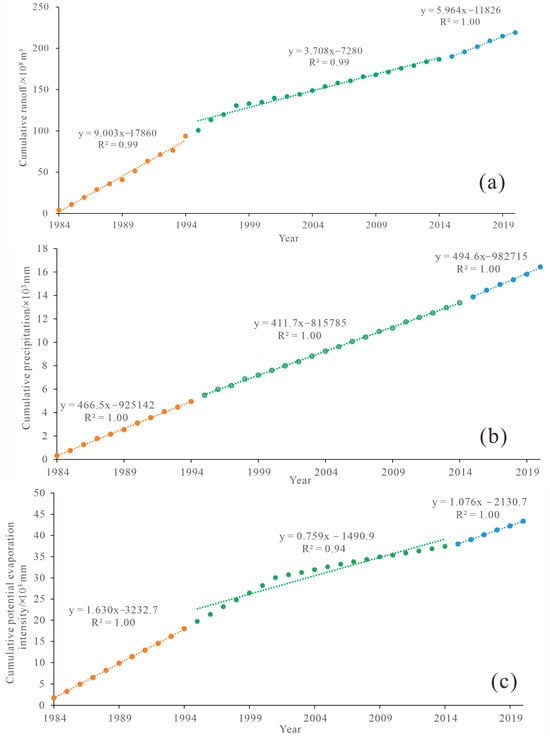 29] was used to obtain the relationship equations among the cumulative precipitation, cumulative runoff, and cumulative potential evaporation intensity and the years in each period. The principle of the Slope Change Ratio of Cumulative Quantity Comparison Method is as follows: According to the water balance equation of the entire basin