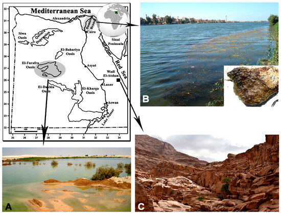 Sampling sites in the present studies. (A) the desert oasis lake Abu Nuss in the El-Farafra Oasis, the Western Desert of Egypt; (B) the Damietta Branch of the River Nile, note the epilithon where the diatom samples were collected; and (C) the arid valley “Wadi El-Atshan”, located in the Eastern Desert of Egypt.