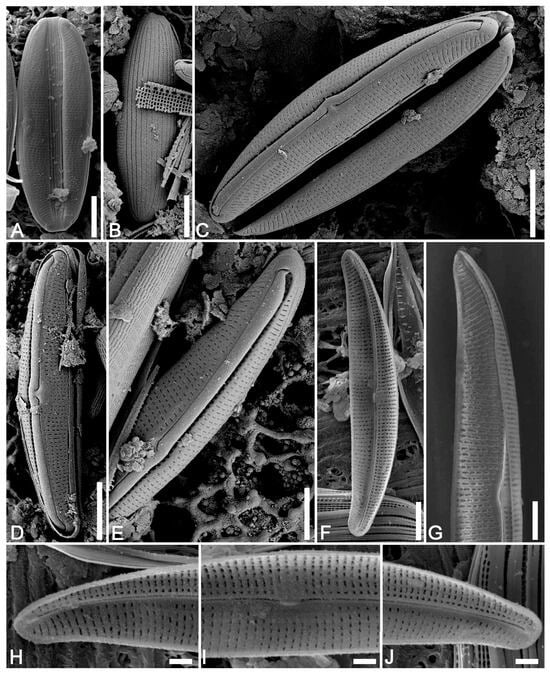 (A–H) SEM micrographs of the type population of Halamphora shaabanii sp. nov.; (A–C) girdle views of whole frustules. Notice the numerous girdle bands; (D) external view of whole valve; (E) external detailed view of mid-valve showing the raphe ledge and proximal raphe ends; (F,G) internal views of whole valves; (H,J) internal detailed views of distal raphe ends and helictoglossae; and (I) internal detailed view of mid-valve showing fused central helictoglossa and detail of areolae. Scale bars = 5 µm (A–D), 3 µm (E–G), and 1 µm (H–J).