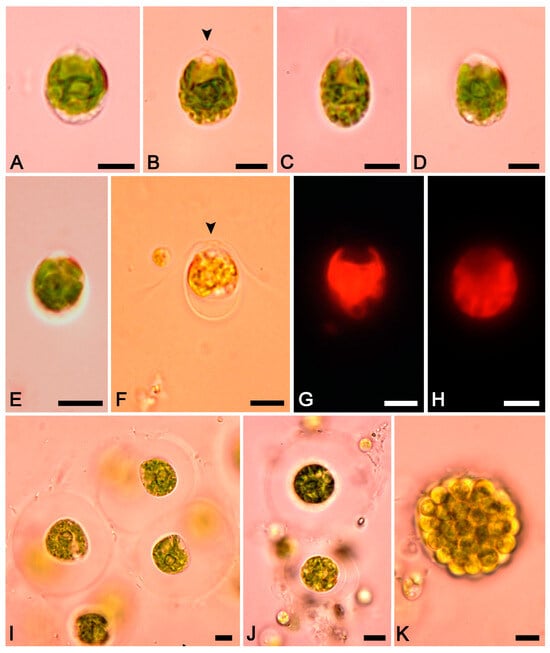 Light micrographs of Chlamydomonas proboscigera showing its detailed morphotaxonomic features and lifecycle stages. (A–F) Subspherical to ellipsoidal vegetative cells. Notice flattened papilla (arrowheads) and stigma located anteriorly in the chloroplast; (G,H) autofluorescent cup-shaped chloroplasts; (I,J) palmelloid stages; and (K) asexual zoosporangium. Scale bars = 5 μm.