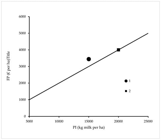 The FP shows a distinct relationship with production intensity. This relationship was established using data from 4608 farms on sandy soils, obtained from the Centrale Database KringloopWijzer (CDKLW), managed by ZuivelNL [37]. This dataset served as a benchmark for the study and was accessed under specific agreements that restrict public dissemination of the raw data. The Relative Fodder Profitability (RFP) was defined as the difference between the fodder profitability of a pilot farm and a benchmark at an equal production intensity. This allows for a comparison of farms with different production intensities, providing a measure of how well a farm performs in terms of FP compared to the benchmark at an equivalent production intensity (Figure 1). Thus, farm 1 was compared with the benchmark at a production intensity of 15,000 kg milk per ha, i.e., 3443 € per ha, and farm 2 at a production intensity of 20,000 kg milk per ha, i.e., 4000 € per ha, implying that farm 1 performs better in terms of RFP than farm 2, whereas the FP of farm 2 is higher than that of farm 1.
