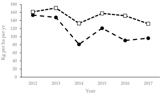 Figure 2 presents the dynamic trends in the soil N surplus for pilot farms in comparison to FADN farms. The N surplus of both groups of farmers did not differ significantly in 2012 and 2013. However, a notable shift occurred from 2014 onward, with the N surplus on the pilot farms being significantly lower than that of FADN farms (p < 0.05). Throughout the project duration, the N surplus of the pilot farms showed a significant (p < 0.05) decline from 153 to 96 kg/ha, showcasing a decline rate of 11.8 kg N per year (p < 0.004). Over the entire research period, 60% of the pilot farmers exceeded the N surplus of 100 kg/ha. This fraction showed a significant decline from 80% in 2012 and 90% in 2013 to just 10%. It then stabilized at 57% in 2015 and 56% in 2016, followed by a slight decrease to 0.44% by the end of the study. In contrast, the N surplus of FADN farms showed annual fluctuations without a clear trend. The dynamic trends of N surpluses also show some similarities for the two groups of farmers, e.g., relatively low values in 2014 and higher values in 2015. This may be attributed to the effects of annual fluctuations in weather conditions.