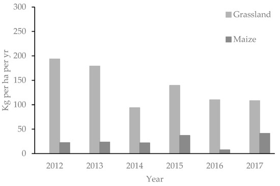Figure 3 provides a more detailed analysis of the trends in soil N surplus, focusing on the main crops on the farms: grassland and maize. A distinct decline over time is observed in the N surplus for grassland (p < 0.05), whereas no clear trend is observed for maize. Additionally, the N surplus in maize is consistently lower than that for grassland throughout the research period.