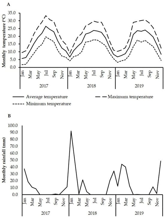 Weather conditions during the whole study period 2017–2019. (A) Monthly average, minimum, and maximum temperatures; (B) average monthly rainfall at the Sweileh weather station (CLIM0015, latitude 32°02′47.2″ N and longitude 35°91′50.0″ E, with an altitude of 1086 m), the nearest weather station to the experiment site.