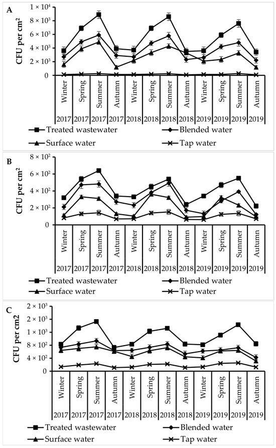 The highest E. coli population, with 8.9 × 103 CFU per cm2 in Summer 2017, was detected on the leaves of the plants irrigated with the TWW, followed by the leaves of the plants irrigated with the TWW, with 8.6 × 103 and 7.6 × 103 CFU per cm2, in Summer 2018 and Summer 2019, respectively, while the lowest abundance was found on the leaves of the plants irrigated with the TW, with 70 CFU per cm2 (Figure 2A). The Enterococci spp. were determined to be most abundant on the leaves of the plants irrigated with the TWW, with 6.4 × 102 CFU per cm2 in Summer 2017, while the lowest abundance was found on the leaves of the plants irrigated with, with 62 CFU per cm2 in Winter 2019 (Figure 2B). The highest population of P. aeruginosa, with 1.5 × 103 CFU per cm2 in Summer 2017, was detected on the leaves of the plants irrigated with the TWW, and the lowest, with 1.1 × 102 CFU per cm2 in Fall 2017, was on the leaves of the plants irrigated with the TW (Figure 2C). The highest population of Salmonella spp., with 5.5 × 102 CFU per cm2 in Summer 2017, was detected on the leaves of the TWW-irrigated plants, followed by Summer 2019 and 2018, and the lowest, with 15 CFU per cm2 in Winter 2019, was on the leaves of the plants irrigated with the TW (Figure 2D). The highest population of Staphylococcus spp., with 8.2 × 102 in Summer 2017, was detected on the leaves of the plants irrigated with the TWW, and the lowest, with 67 in Winter 2019, was on the leaves of the plants irrigated with the TW (Figure 2E).