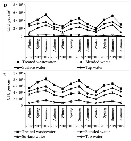 The impact of water type on microbes’ populations on leaves’ surfaces. (A) E. coli; (B) Enterococci spp.; (C) Pseudomonas aeruginosa; (D) Salmonella spp.; (E) Staphylococcus spp.