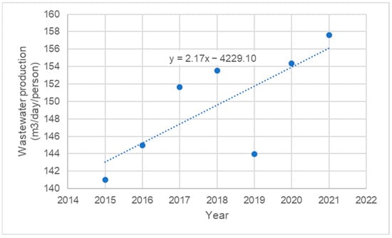 The per capita production of wastewater in SMC increased from 2015 to 2021 (Figure 1). This trend was assumed to continue until 2050 in this study. Therefore, the total volume of treated wastewater for WWTPs in 2050 was estimated by multiplying the projected population served by WWTPs by per capita wastewater production.