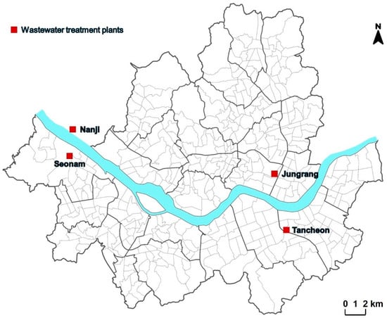 The following supporting information can be downloaded at: https://www.mdpi.com/article/10.3390/w17040464/s1, Table S1: Unit processes of the Nanji plant; Table S2: Unit processes of the Jungrang plant; Table S3: Unit processes of the Tancheon plant; Table S4: Unit processes of the Seonam plant.