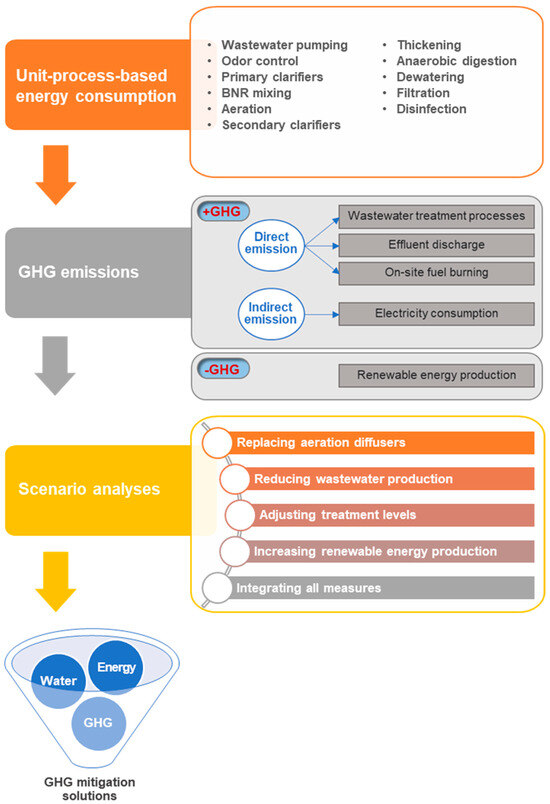 This study performed a three-step procedure to develop customized strategies for mitigating GHG emissions (Figure 3). First, unit-process-based energy consumption was quantitatively estimated by analyzing all unit processes within each WWTP. Second, direct GHG emissions from treatment processes, effluent discharge, and on-site fuel burning as well as indirect emissions from electricity use were calculated. Finally, feasible scenarios for GHG mitigation were analyzed to identify effective measures and their impacts.