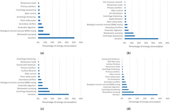 Measurement data required for estimating energy consumed by the unit processes of the WWTPs were unavailable. Consequently, appropriate unit processes with their intensities were selected from Reekie et al. [28] based on the plant-related information provided by the SMG to describe the detailed layouts shown in Section 2. The unique set of unit processes for individual WWTPs enables the characterization of all relevant processes in a WWTP. Based on the energy intensity ranges of unit processes provided by Reekie et al. [28] and the daily influent rates of WWTPs, the energy consumption of most unit processes in individual plants was determined. The energy use for odor control was estimated using the energy intensity values recommended by Cho [27]. The energy intensity values used for odor control were 0.0079, 0.0075, 0.0090, and 0.0073 kWh/m3 for the Nanji, Jungrang, Tancheon, and Seonam plants, respectively. This unit-process-based method enables straightforward application to different WWTPs by including various unit processes. In addition, this method is also appropriate for comparing different combinations of treatment processes or technologies.