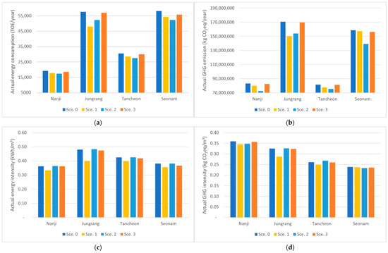 Results of scenario analyses. (a) Actual energy consumption; (b) Actual GHG emissions; (c) Actual energy intensity; (d) Actual GHG emission intensity.