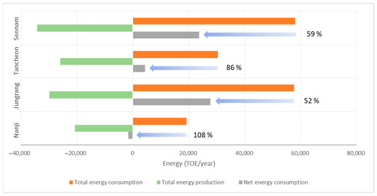 Renewable energy produced from WWTPs could significantly offset the total energy consumption if used to replace electricity and fuel, as shown in the results of Scenario 4 (Figure 7). Figure 7 shows that the increased renewable energy production covers 108%, 52%, 86%, and 59% of the total energy consumption for the Nanji, Jungrang, Tancheon, and Seonam plants, respectively, indicating a high degree of energy self-sufficiency. Achieving energy self-reliance can significantly reduce GHG emissions [10].