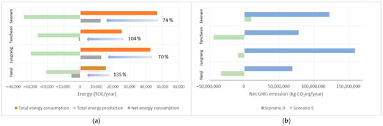 Results of Scenario 5. (a) Net energy consumption; (b) Comparison of net GHG emissions between Scenario 0 and Scenario 5.