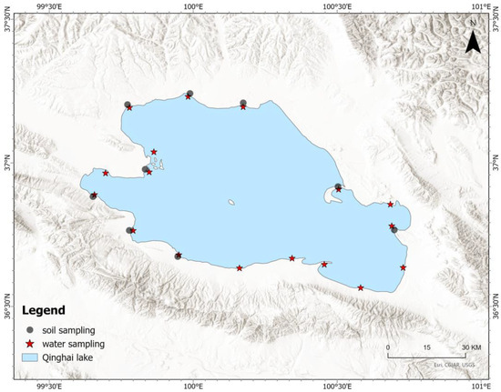 To comprehensively examine the water quality of Qinghai Lake, a total of 17 water samples were collected from various locations across the lake. In addition to water sampling, soil samples were collected from nine distinct locations around the periphery of Qinghai Lake. To understand the vertical distribution of potential influencing factors, such as nutrient leaching or deposition patterns, soil samples were taken at two depths: 50 cm and 300 cm. Therefore, a total of 18 soil samples were collected (Figure 1). The land use types of the soil sample collection sites are shown in Figure S1. After sample collection, the samples were promptly numbered and labels were attached. The collected samples, along with the sampling record sheets, were transported to the laboratory and handed over with proper documentation.