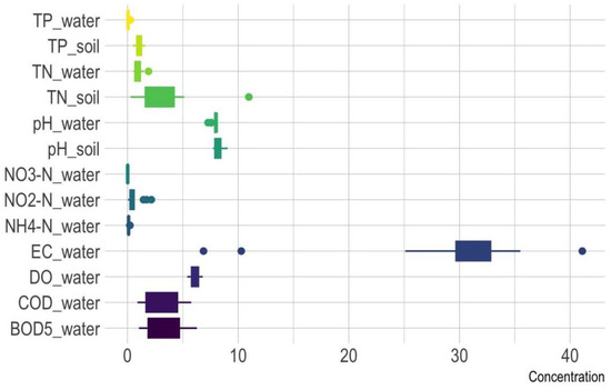 Boxplot of water quality and soil parameters in Qinghai Lake. (NO3_N: NO3−-N; NO2-N: NO2−-N; NH4-N: NH4+-N).