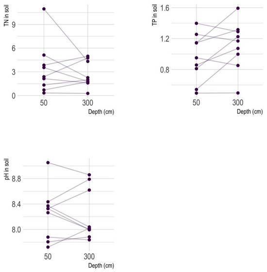 The pH, TN, and TP levels in 50 cm and 300 cm soil.